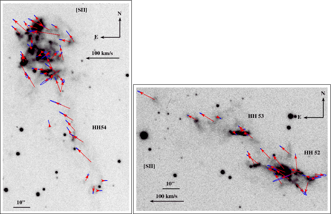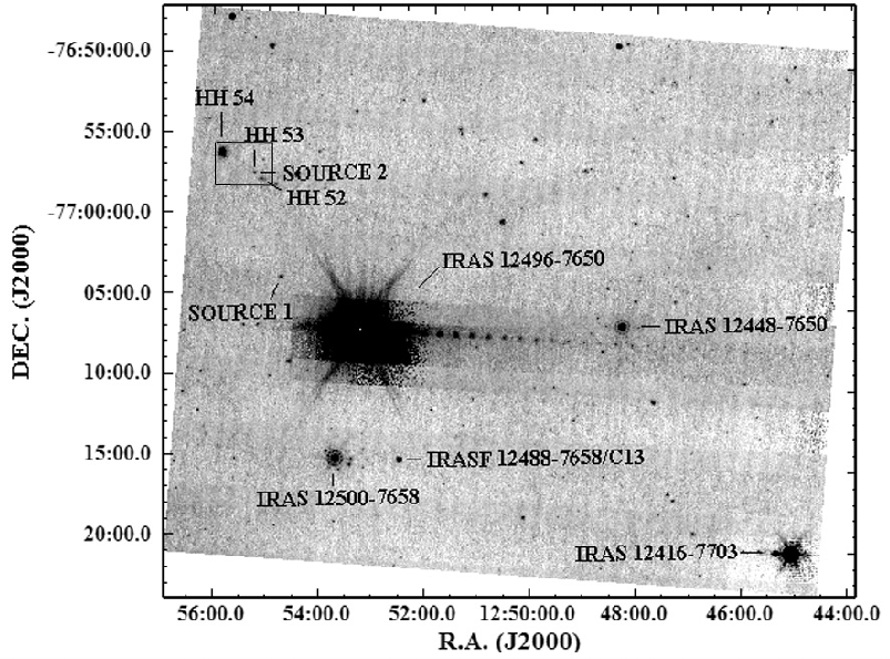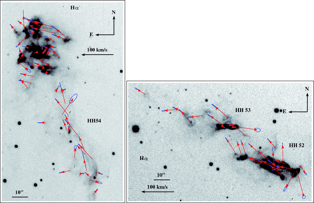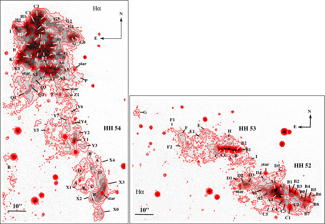 Because of the relatively small FoV of the CCDs used between 1987 and 1990, HH 52 and HH 53, and HH 54 were observed separately with the [S II] (