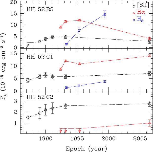 Variability in morphology and flux of HH 52. Left panel: close up of HH 52 from 1993 H |