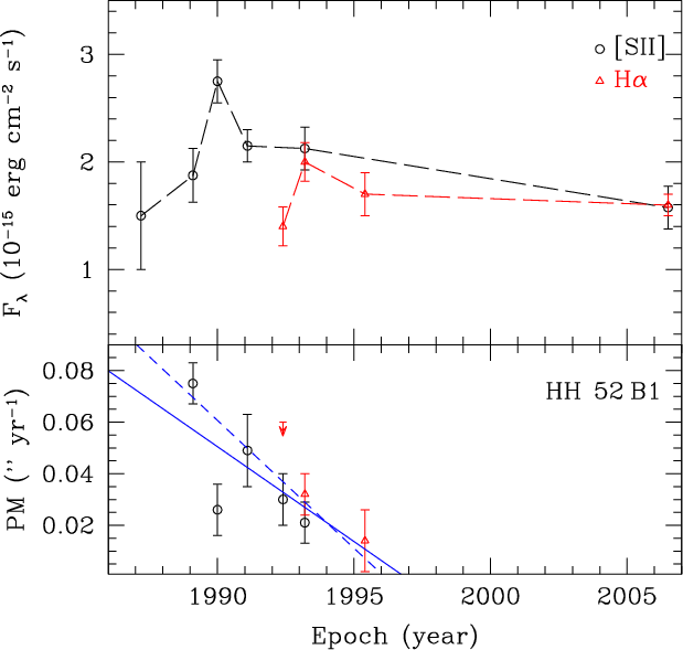 Variability in HH 52 B1. Bottom panel shows the PMs as a function of time in both [S II] (circles), and H |