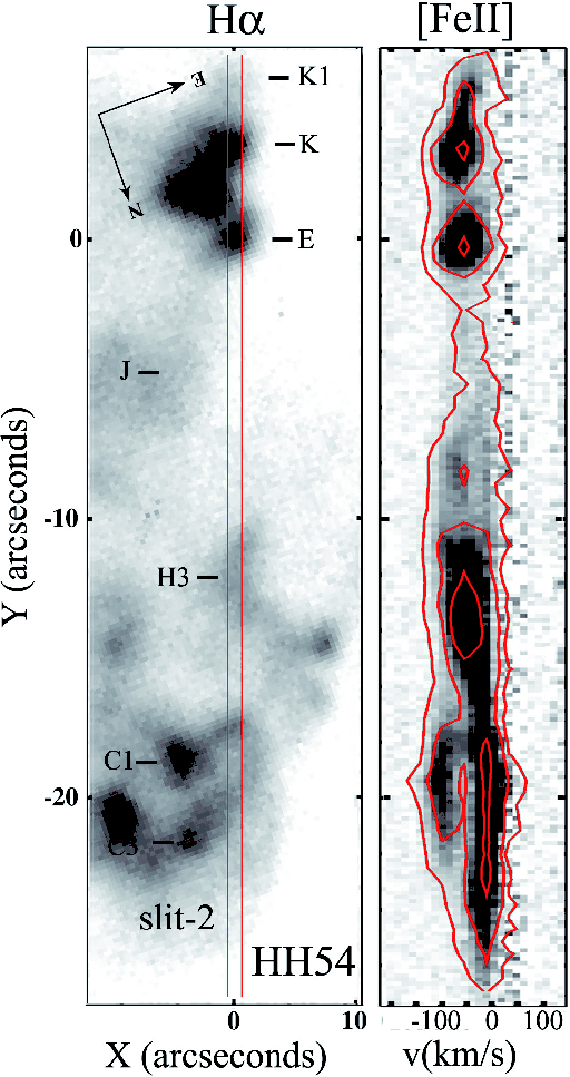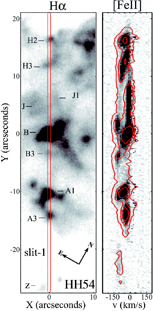 Graham & Hartigan (1988), but the value measured in the middle (considering also the errors) is lower than ours of 10-20 km s-1. Such a difference in their values could be due to a not perfect positioning of the slit, due to the sinuous geometry of the HH 54 streamer.