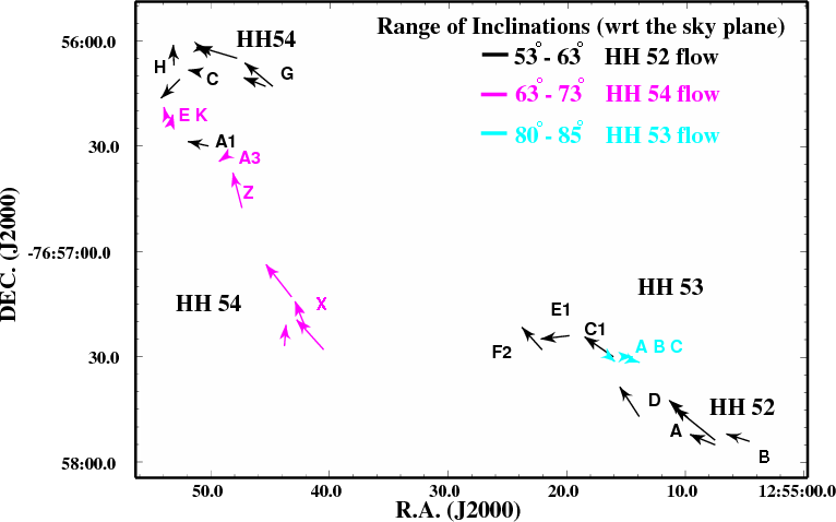 The association of groups HH 54 G and C to the HH 52 outflow is also confirmed. HH 54 G0 has an inclination of 55