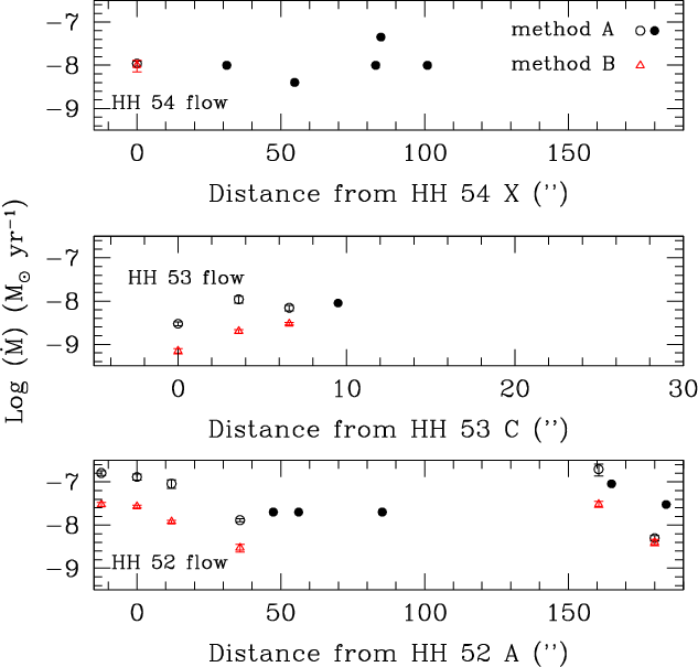 Mass fluxes derived for HH 52 (bottom panel), HH 53 (central panel), and HH 54 flows (upper panel). Circles and triangles refer to |