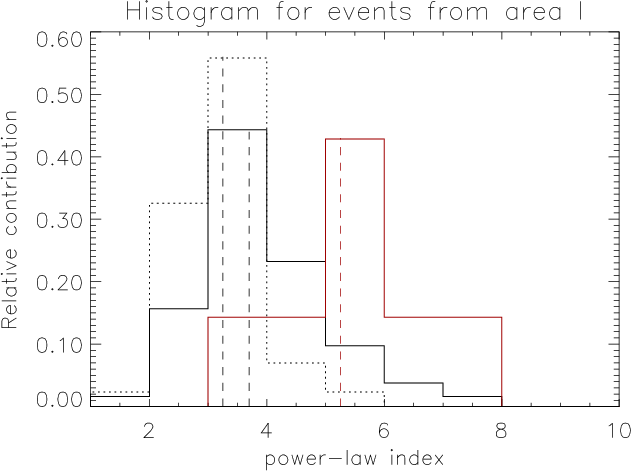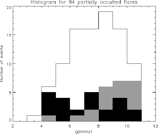 Figure 4: Histogram of values of power-law index obtained for 94 partially occulted flares in energy range 14-33 keV. Gray bins represent 24 events that were not observed in the maximum of hard X-rays, black bins represent 24 events with possibly footpoint contamination. |