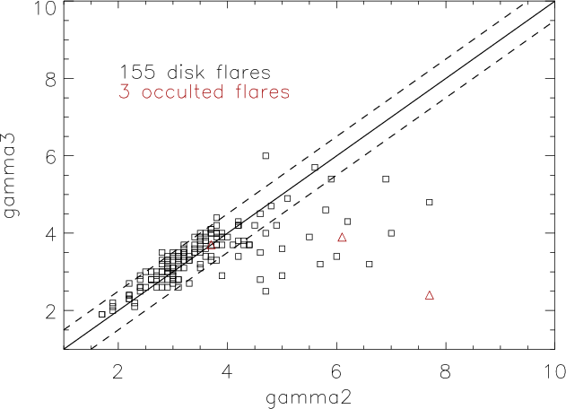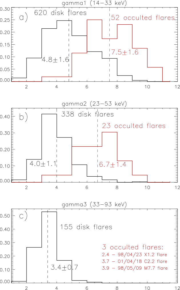 Figure 5: Normalized histograms of values of the power-law index fitted in different ranges of the hard X-ray energy photon spectrum. Separate histograms for partially occulted and disk flares are presented. Energy ranges, number of events, average values and standard deviations are written. |