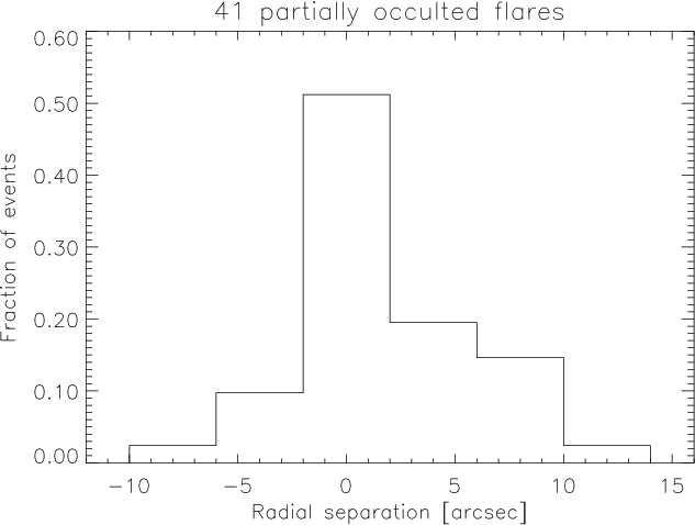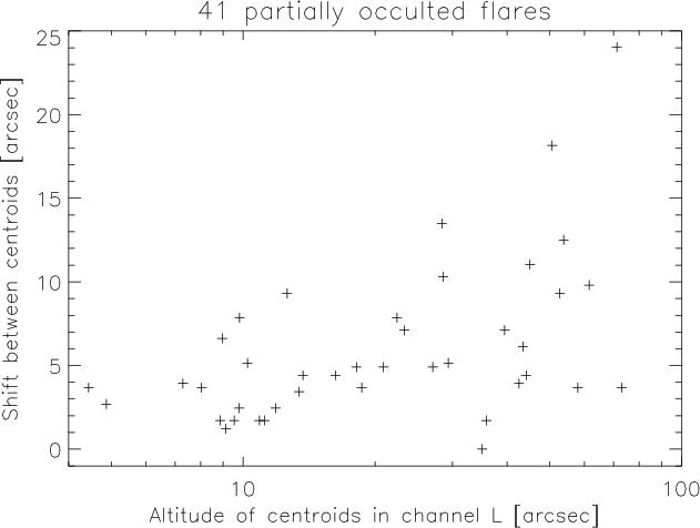 Figure 10: The shift between centroids of hard (HXT, energy band L) and soft (SXT, Be119 filter) X-ray emission against the altitude of the centroid of hard X-ray emission for 41 partially occulted flares. |