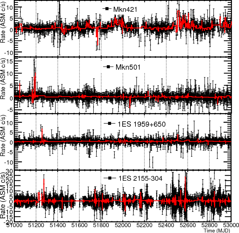 Figure 1: Comparison between RXTE/ASM light curve (black points) and the MLBs (red line) for Mkn 421, Mkn 501, 1ES 1959+650, 1ES 2155-304. The period of time reported in the figure is a sub-period respect the one analyzed; data considered in the paper have been collected for the period MJD 50 200-53 698 that corresponds to nearly 10 years. |