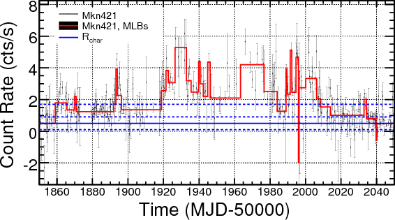 A variety of methods are used in astrophysics in order to assess the variability of a source and to qualify the character of the variability (periodic, correlated etc.). It is not our intention here to review these methods. Each method is designed for a specific purpose. Often, data are affected by large uncertainties or the data spacing is rather inhomogeneous. The driving factors for the selection of a method are the goals of the analysis and the quality of the data to be analyzed. In our case we need a method that addresses the variability issue on light curves which are unevenly spaced and have short and long breaks, takes into consideration the statistical errors and possible unknown instrumental fluctuations on the measurements and gives a representation of the light curve in term of periods in which the data points are compatible with a constant level. A method that could satisfy these requirements is the Maximum Likelihood Blocks. The entire data analysis reported here is performed in ROOT (Brun & Rademakers 1997), an object-oriented data analysis framework. The only exception is for the Maximum Likelihood Blocks algorithm which is currently an IDL based program.