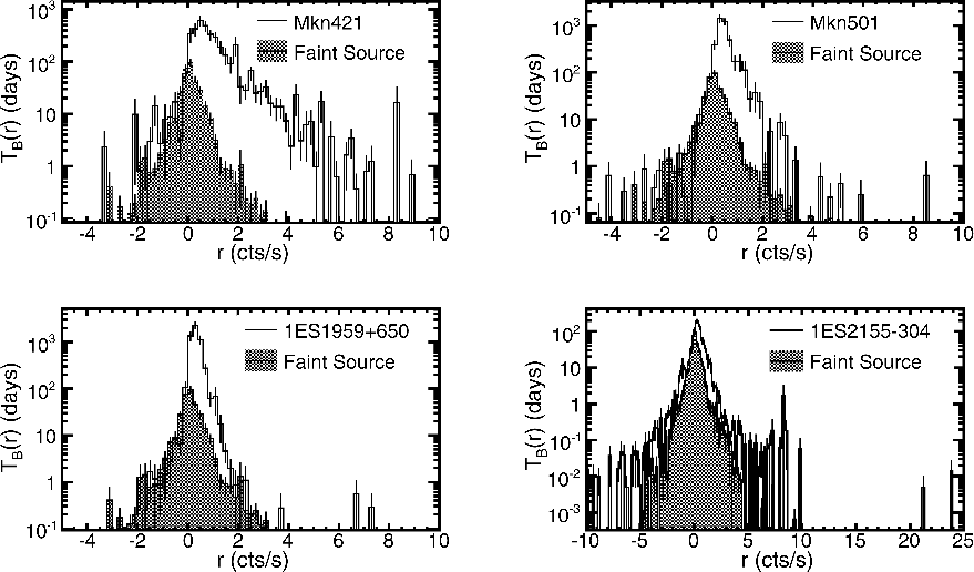 Figure 3: Integrated time flux distribution for Mkn 421 ( top-left), Mkn 501 ( top-right), 1ES 1959+650 ( bottom-left) and 1ES 2155-304 ( bottom-right). The distributions are compared with the integrated time flux distribution of a very faint source (dark background). |