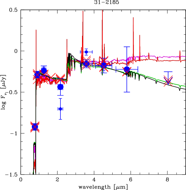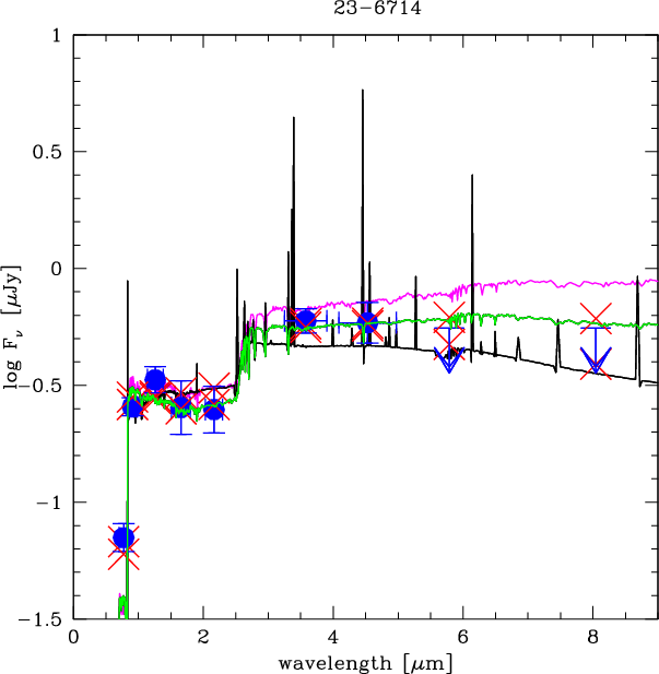 Observed (blue points) and best-fit SEDs (solid lines) of the z=5.83 galaxy 23_ 6714 from E07. The errorbars of the observed wavelength indicate the surface of the normalised filter transmission curve. Upper limits in flux indicate |