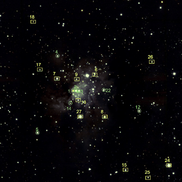 Figure 5: False color composition image of the central part of the G61.48+0.09 field. The position of the spectroscopically observed stars is shown. The early-type stars (see Table 2) have been marked with circles, and the rest with squares. |