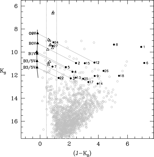 Figure 10: Calibrated color-magnitude diagram of the G61.48+0.09 star-forming region. The spectroscopically observed stars have been marked with filled circles. Filled triangles show the position of the reddening corrected early type stars, that is, they show the reddening corrected cluster main sequence. Open triangles show the reddening corrected position of the late type stars. The solid line shows the zero-age main sequence located at a distance of 2.5 kpc. Vertical dashed lines show the intrinsic color interval of the late type stars with spectral types between G0III and M3III. |