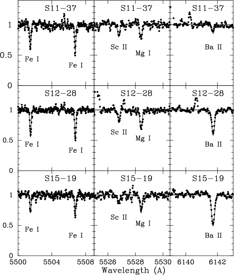 Figure 1: Observed spectra of the three Sextans objects S 11-37, S12-28, and S15-19 for three wavelength ranges (dots). Synthetic spectra calculated for the derived Mg, Sc, Fe and Ba abundances (Table 4) are also shown. |