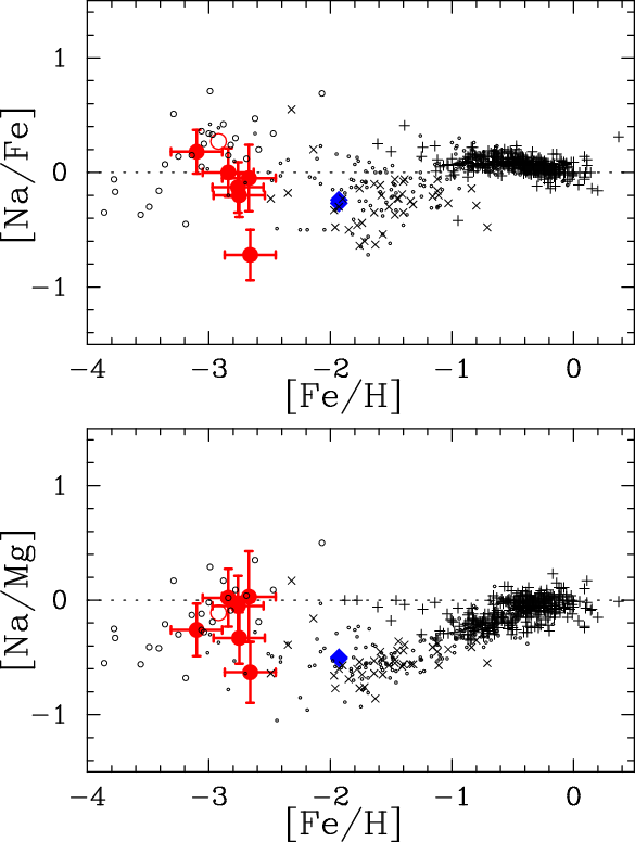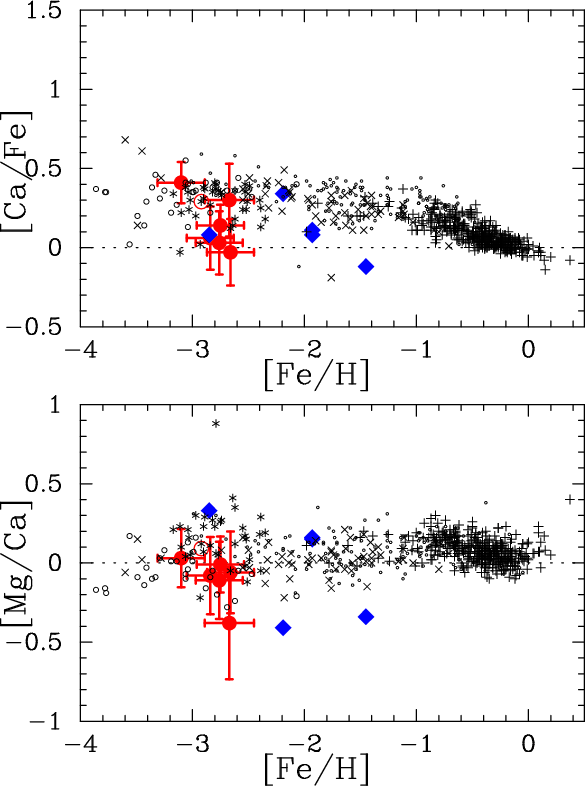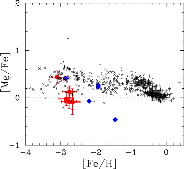 - The Mg/Fe ratios of extremely metal-poor red giants in the Galactic halo are shown in Fig. 2. These values are adopted from Cayrel et al. (2004), Honda et al. (2004) and Aoki et al. (2005). As discussed by Aoki et al. (2005), there is a small systematic differences in the [Mg/Fe] values between Cayrel et al. (2004) and the other two papers: over the metallicity range of -3.2 < [Fe/H] < -2.5, which is that studied here, the average of the [Mg/Fe] = +0.30 in Cayrel et al. (2004), while it is +0.42 in Honda et al. (2004) and Aoki et al. (2005). We note that the remarkably Mg-enhanced ([Mg/Fe] = +1.25) star BS 16934-005 (Aoki et al. 2007b) is excluded from the sample of Aoki et al. (2005).
