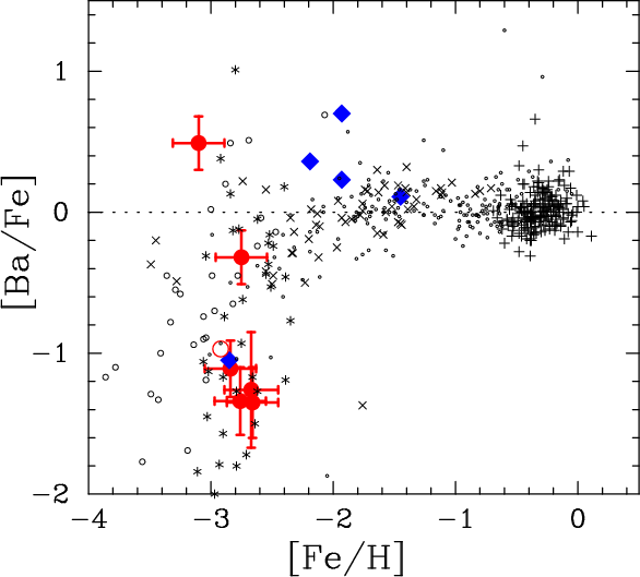 ), thus they only start to contribute at [Fe/H] = -3. It is interesting that a similar enrichment pattern of Ba is found in the Sextans sample. The origin of the Ba excesses in the two Ba-enhanced stars could then be due to the r-process. If so, then this could have an impact on our understanding of the r-process, in general, since the star formation histories are expected to have been quite different between the Galactic halo and the classical dwarf galaxies. For example, perhaps the progenitor mass is not the critical condition for the r-process, but instead the metallicity is the key to the r-process events. To confirm this hypothesis, measurements of other neutron-capture elements for the Ba-enhanced star S 15-19 would