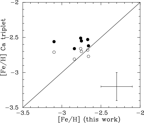 Results. (1) The Fe abundances derived from the high resolution spectra are in good agreement with the metallicity estimated from the Ca triplet lines in low resolution spectra. The lack of stars with [Fe/H]