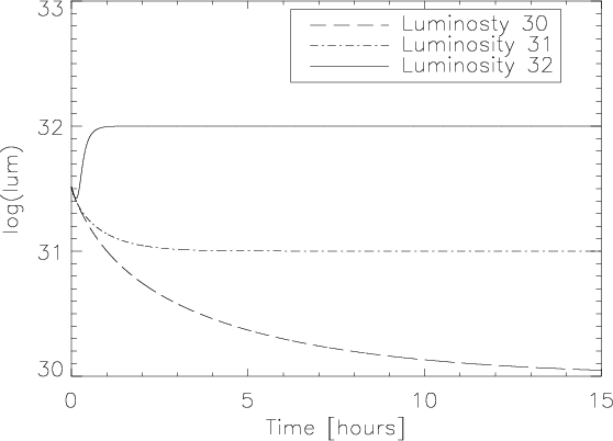 Figure 1: Three different light curves for the evolution to a stationary state. The three models have different luminosities produced by differentinner ``lightbulbs''. |