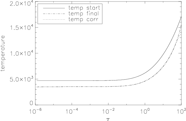 The final temperature structure of the model atmosphere with the lightbulb with a luminosity of 1031 erg/s is displayed in Fig. 2. Also shown is the result of a calculation using the temperature correction procedure of PHOENIX (Hauschildt et al. 2003) to directly compute the radiative equilibrium structure of the configuration. As one can clearly see, the resulting temperature structure of both methods agrees very well, and the maximum deviation of the temperature structure is less than one percent. Only the inner three layers have a deviation of up to 10 percent due to the implicit assumption of a diffusion approximation (and not a lightbulb) in the static calculation.