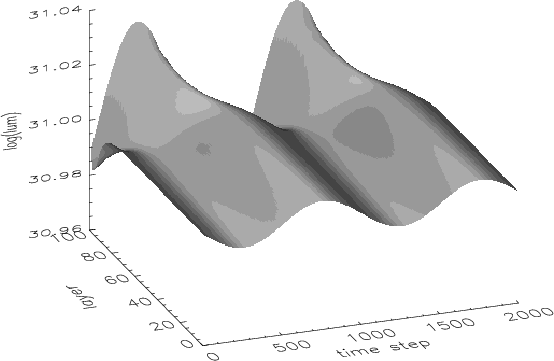 In the next test we put a sinusoidally varying light bulb inside of our test atmosphere. In Fig. 11, we show a plot of the luminosity for each time step. After a while, the luminosity of the whole atmosphere varies sinusoidally and steady state is reached.