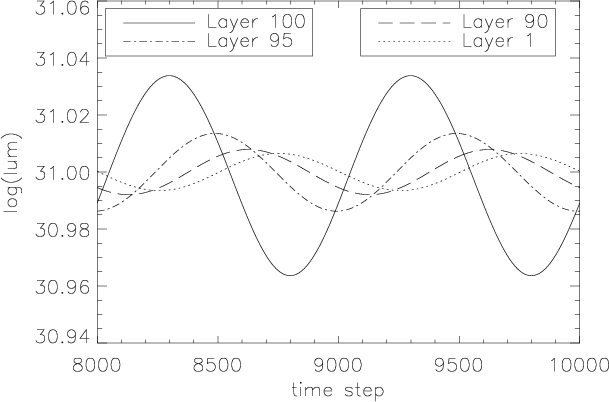 We now take a look at the luminosity in different layers. These are plotted in Fig. 4. One can see the phase shift of the sine in each layer. As expected, the luminosity from the central source needs time to move through the atmosphere.