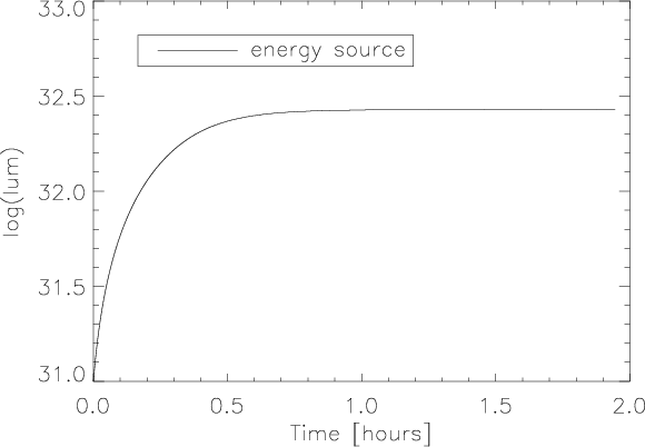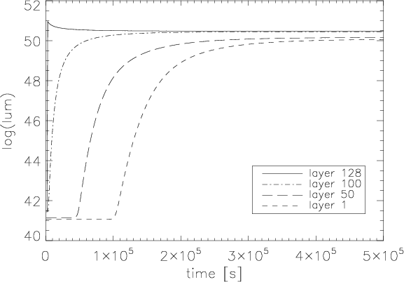 For the next test we consider an atmosphere with an internal energy source. The initial structure is the radiative equilibrium structure of the static model with the lightbulb with a luminosity of 1031 erg/s. We assume a constant energy deposition rate in each layer of the model atmosphere. The luminosity is expected to increase over time and towards the outside. Figure 5 shows a plot of the light curve of this test atmosphere. The luminosity increases in time because of the energy deposition.