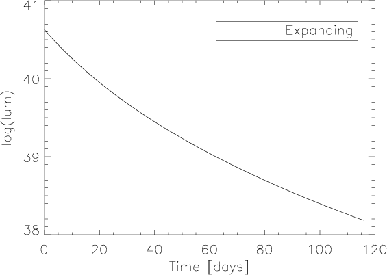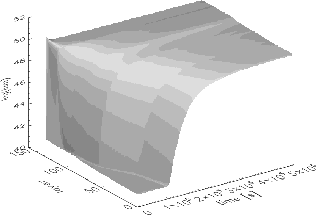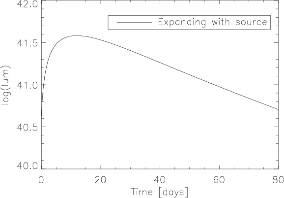 We now have all the needed equations to calculate a simple light curve. One problem for the calculation is that we can only determine the change in the total energy density for the next time step. However, the total energy change is divided into a change in the gas energy density and the energy density of the radiation field. To obtain the correct distribution of the gas and radiative energy, one has to iterate for each time step by solving the radiative transfer equation to compute the correct new temperature at the next time step.