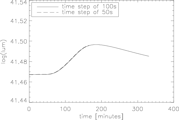 An important test is also to check that the results of the time-dependent radiative transfer calculation depend on the size of the time step. We tested this with a model that has a small perturbation inside that is moving outwards. This was calculated with two different time steps. In Fig. 10 the results of calculations with two different time steps are shown. As one can see, the result does not depend on the size of the time step.
