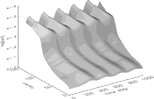 Figure 8: Luminosity of each layer and time step of our test atmosphere. |