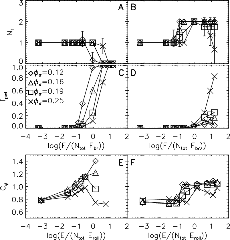 ), the collision outcome involves many other parameters (discussed in Sect. 3.3). These parameters are provided in tabulated form as a function of three input parameters - dimensionless energy parameter, filling factor, and impact parameter b - for both the local and the global recipe. To obtain these collision parameters, direct numerical simulations between two colliding aggregates were performed, in which the equations of motions for all grains within the two colliding aggregates are computed (Paszun & Dominik 2009). An example of these quantities is the fraction of missing collisions, which is a result of the fact that we have defined the collision cross section