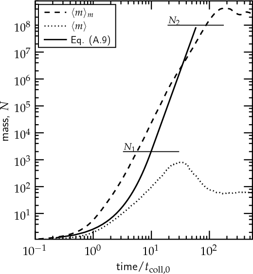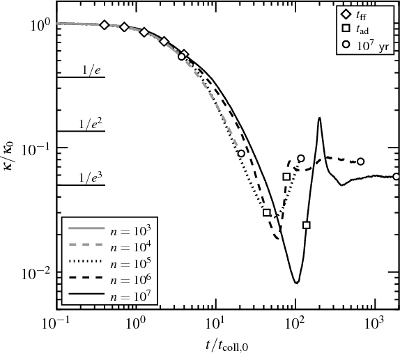 In this exploratory study we will for simplicity adopt an homogeneous core of mass given by the critical Jeans mass. Moreover, we assume the cloud is turbulent, but neglect the influence of the turbulence on the support of the cloud. Thus, our approximation is probably applicable for high density, low mass cores as velocity dispersions increase towards high mass cores (Kawamura et al. 1998). The homogeneous structure ensures that collision timescales are the same throughout the cloud, i.e., the coagulation and fragmentation can be treated locally. In our calculations, the sensitivity of the coagulation on the gas density n will be investigated and the relevant coagulation and fragmentation timescales will be compared to the timescales in Eqs. (1) and (2).