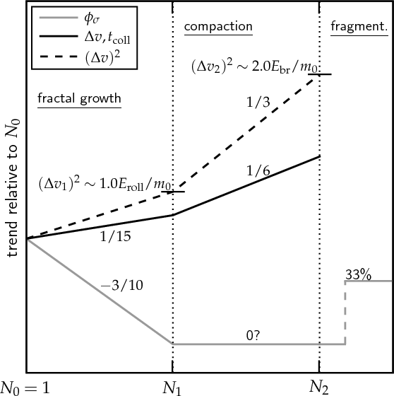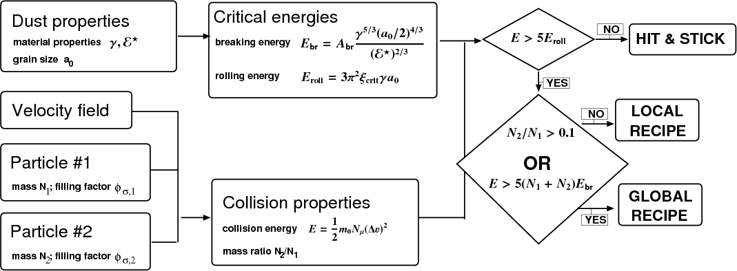 Theoretically, our understanding of the coagulation process has been much improved by the development of the atomic force microscope, which has provided much insight in the binding of individual monomers. This has been translated into simple relationships between velocities and material parameters, which prescribe under which conditions sticking, compaction, and fragmentation occur (Dominik & Tielens 1997; Chokshi et al. 1993). Over the last decade, a number of elegant experimental studies by Blum and coworkers (see Blum & Wurm 2008) have provided direct support for these concepts and in many ways expanded our understanding of the coagulation process. Numerical simulations have translated these concepts into simple recipes, which link the collisional parameters and the aggregate properties to the structures of the evolving aggregates (Paszun & Dominik 2009). Together with the development of Monte Carlo methods, in which particles are individually followed (Zsom & Dullemond 2008; Ormel et al. 2007), these studies provide a much better framework for modeling the coagulation process than hitherto possible.