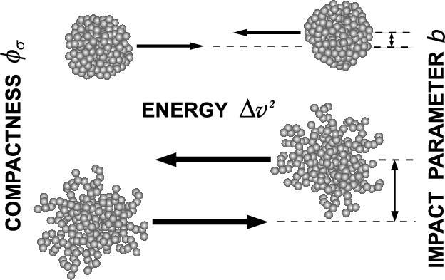 - global. The collision outcome results in a major change to the structure or size of the target aggregate. Relevant for equal-size particles or at large energies.