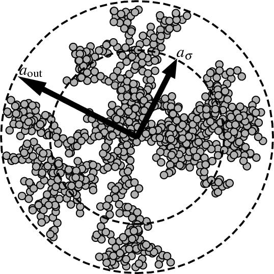 2D projection of a fluffy aggregate with indication of the geometrical radii, |