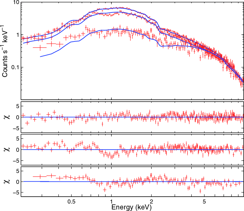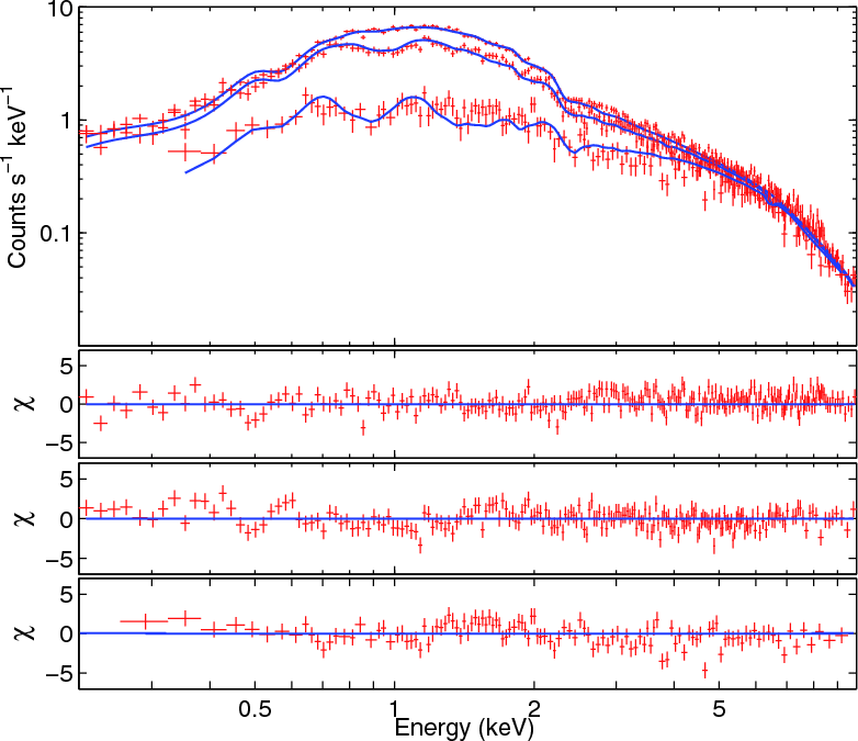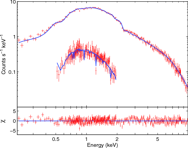 We use EPIC-pn spectra in the energy range 0.2-10 keV. We restrict the RGS spectra (RGS1 and RGS2, order 1) to the energy range of 0.5-2.0 keV because very few source events are detected below 0.5 keV.