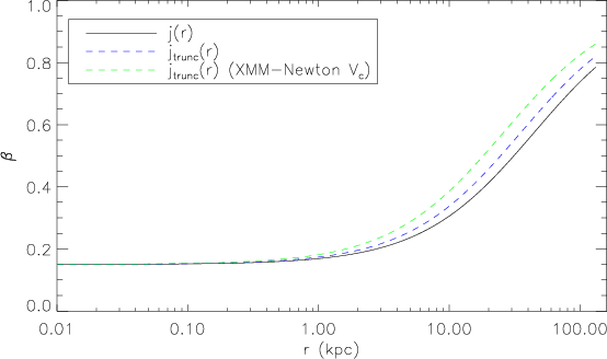 The reason for the truncation is not obvious; we discuss possible mechanisms in Sect. 4.5. Differently from some dense clusters where lensing analysis indicates that galaxies outside the cluster center are tidally truncated by the dark matter cusp of the cluster, M 87 in Virgo is located at the center of the deepest potential well traced by the X-ray isophotes. We also do not see unbound PNs with velocities near 1300 km s-1 further out from M 87. This suggests that if there has been a tidal truncation, it would have occurred some time ago during the interaction with another mass concentration, such as around the other massive galaxy in the Virgo core, M 84. Alternatively, due to the dynamical youth of the Virgo cluster, it is also possible that M 87 has not been tidally disturbed yet, and is more similar to an isolated massive elliptical galaxy and should thus still be accreting matter (Abadi et al. 2006). In this case possible explanations for the truncation could be early AGN feedback effects that indirectly truncate star formation in accreting satellites, or adiabatic contraction of the M 87 halo due to cluster dark matter collapsing onto the galaxy.