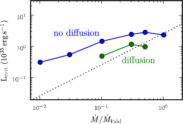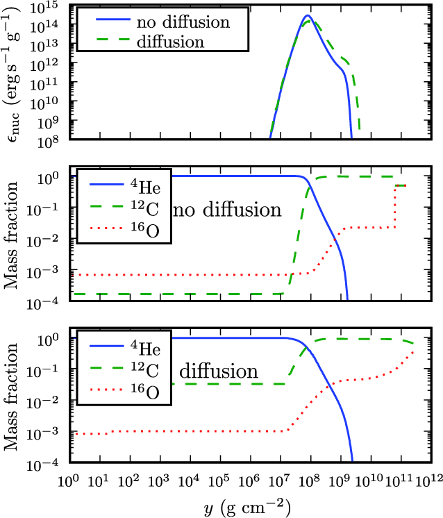 which suggests that stable helium burning does not take place in practice. If the accreted matter is hydrogen-deficient, the transition is expected to take place at an even higher accretion rate because of the lack of heating by stable hydrogen burning: