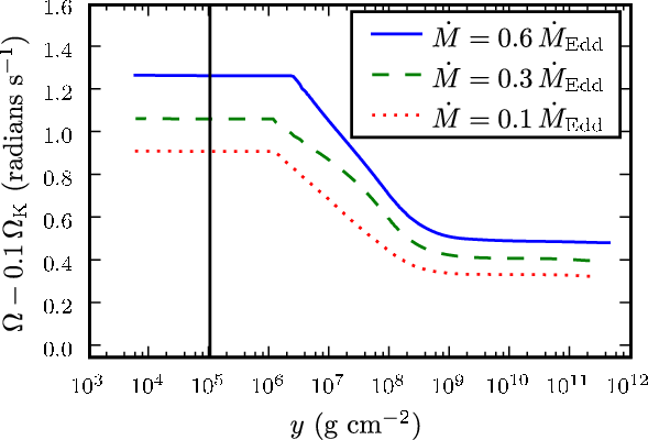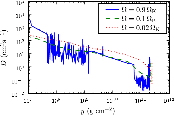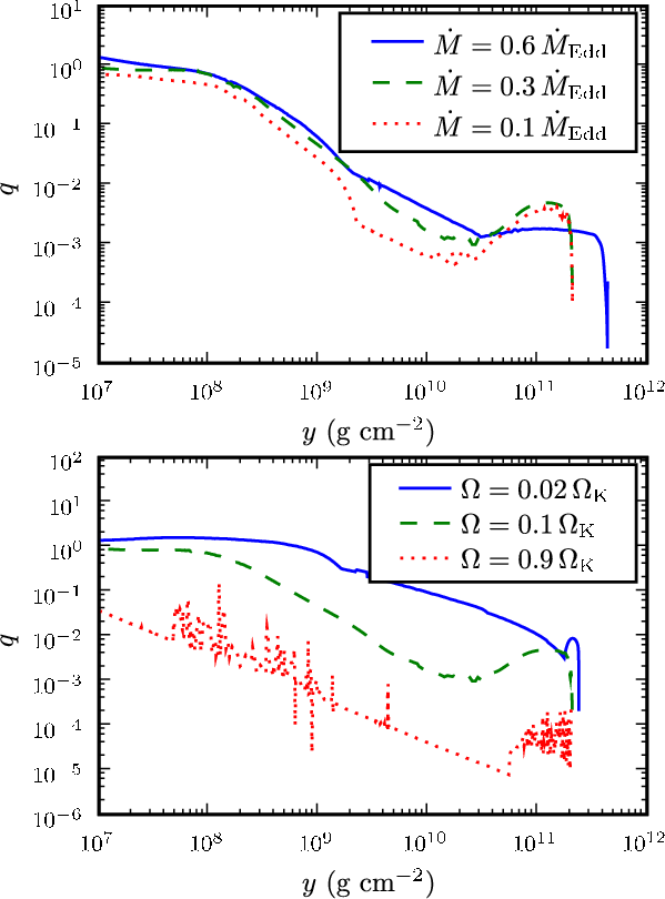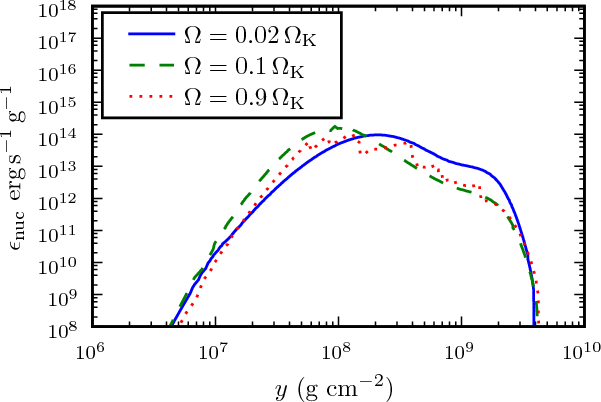 To model the outer layers of the neutron star we employ a stellar evolution code that is a modified version of the code used by Yoon et al. (2004a) to model the nuclear burning of helium shells in white dwarfs. It implicitly solves the stellar structure equations on a one-dimensional grid consisting of a series of mass shells. The effect of the centrifugal force on the stellar structure is taken into account. Consequently, the mass shells are isobars rather than spherical shells (cf. Heger et al. 2000). The chemical evolution is modeled by an extensive nuclear network. The effects of rotation on the chemical mixing and the transport of angular momentum are calculated. The effects of a rotationally induced magnetic field on the mixing of angular momentum and chemical species are calculated as well (Spruit 2002). Convection is taken into account using the Ledoux criterion. Neutrino losses are calculated using the results of Itoh et al. (1996). We make use of the OPAL tables (Iglesias & Rogers 1996) for determining opacities. Heating due to viscous energy dissipation is not taken into account because it will prove to be negligible with respect to the assumed flux from the crust or the energy release from nuclear burning.
