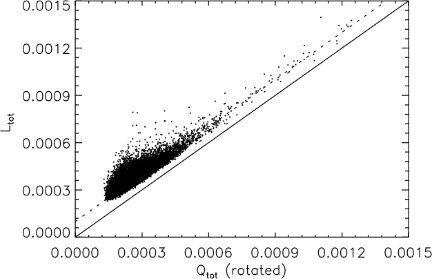 Figure B.1: Scatter plot of the integrated Stokes Q signal in the preferred reference frame versus the total linear polarization without rotation. Solid line: unity slope; dashed line: unity slope with an offset of 0.0001. |