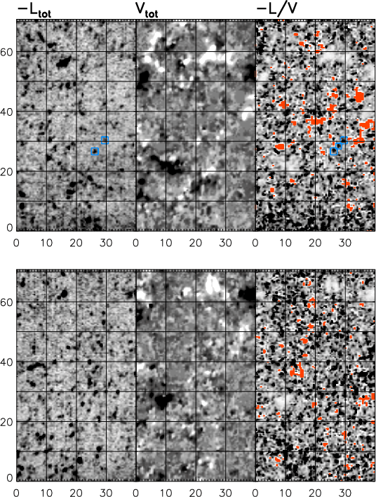 origin, but is instead noise in the Stokes U profile. The final rejection threshold of 0.0014 is, however, only reached by signals clearly related to the Zeeman effect (multiple double or triple lobes).