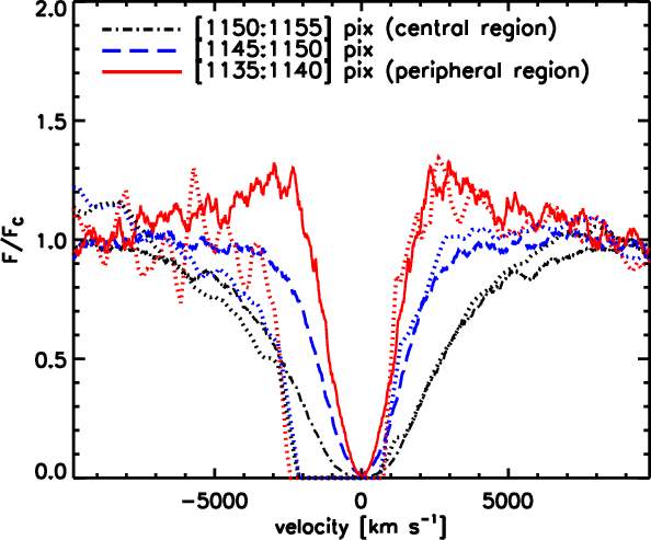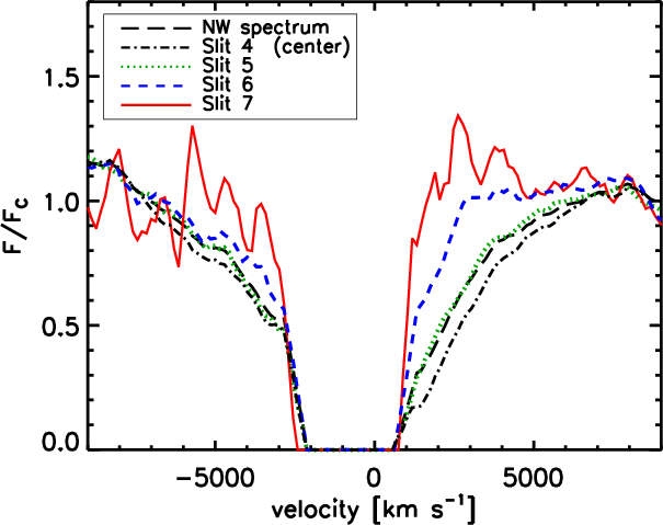 profile is still in absorption in all the NW region and proves narrower toward the peripheral region. To understand these variations we simulated an extended source with a spatially varying UV emission strength by following the 1D spatial profile, in front of a slab of neutral gas with