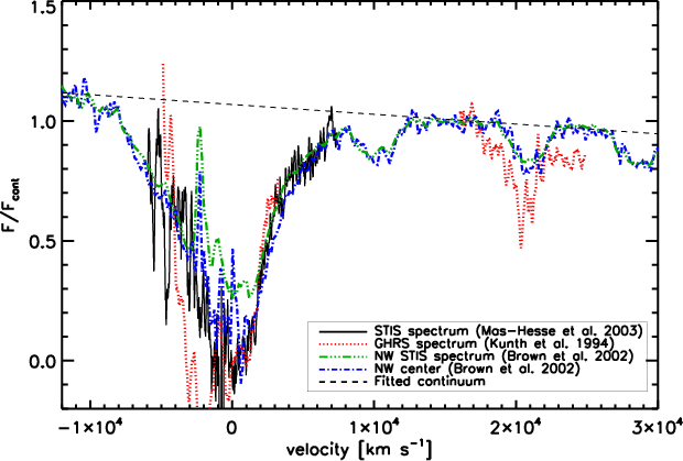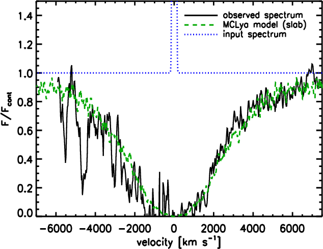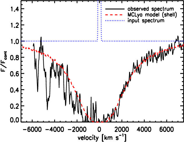 emission line. Adopting dust extinction derived from observations ( E(B-V) = 0.05) and b=20 km s-1, we were able to fit the Ly