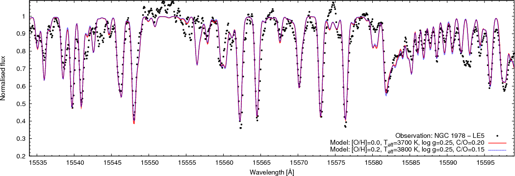 Measurements of the carbon abundance and the carbon isotopic ratio have been done for a few bright field AGB stars (Smith & Lambert 1990; Lambert et al. 1986; Harris et al. 1987). The direct comparison of the values inferred from field star observations to evolutionary models is complicated by the fact that luminosity and mass of those targets can be determined only inaccurately, while both quantities are crucial input parameters for the models. A strategy to circumvent this problem is to observe AGB stars in globular clusters (GC). They provide a rather homogeneous sample with respect to distance, age, mass, and metallicity. Admittedly, this simplistic picture is slowly disintegrating. There is evidence that globular clusters often harbour more than one population with abundance variations among the constituents (Piotto et al. 2007; Renzini 2008; Mackey & Broby Nielsen 2007). The parameters like mass and metallicity are, however, still much better constrained than for field stars. For our purpose, i.e. investigating the abundance variations due to the TDU, the old Milky Way globular clusters are not well suited. The AGB stars of the current generation have an envelope mass too low for TDU to occur, while more massive stars have evolved beyond the AGB phase. The intermediate-age globular clusters in the Large Magellanic Cloud (LMC) serve our needs better. We started with an investigation of the AGB stars in NGC 1846 (Lebzelter et al. 2008, henceforth Paper I) and indeed demonstrated the abundance variation along the AGB due to the TDU.