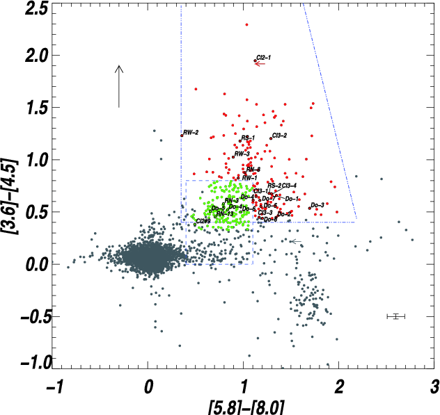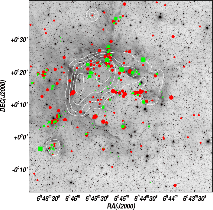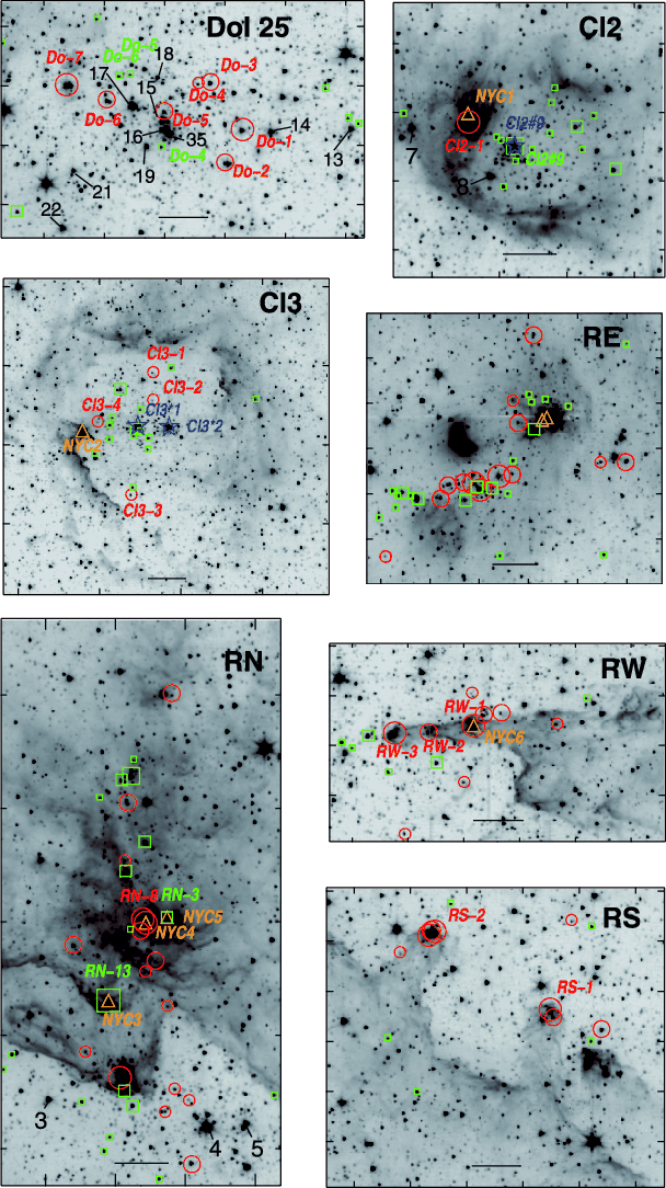 The dominant photospheric component traced by the filters IRAC 3.6 and IRAC 4.5 allows the detection of a cluster at the centre of the three H II regions shown by our H map. These clusters must therefore harbour at least one high-mass star to blow such detectable ionized regions.