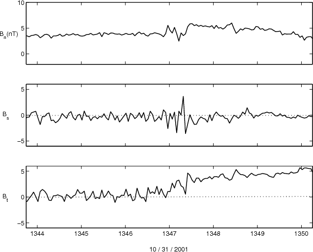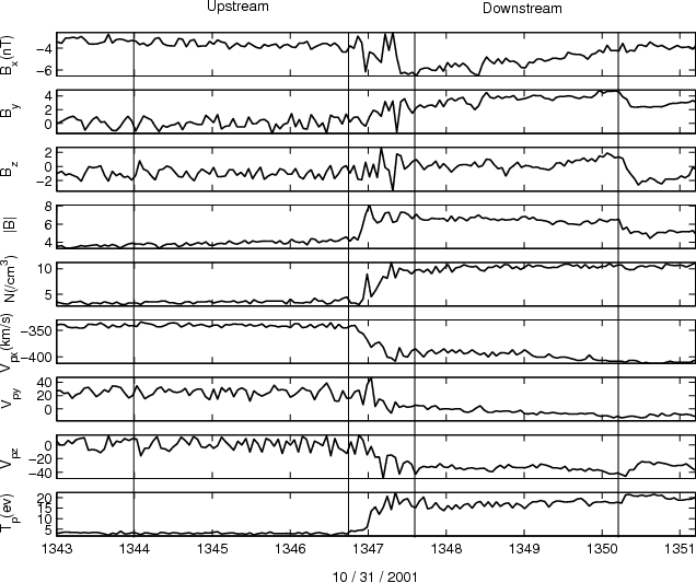 This shock was observed at about 1347 UT on October 31, 2001, with
