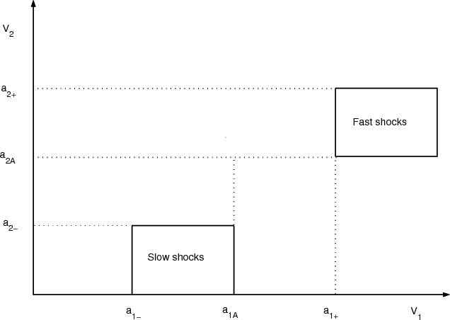 Figure 1: The evolutionarity regions for the fast and slow shocks. Here Vi , ai-, aiA , ai+ are velocities of the gas and of the small disturbances with respect to the jump before (i=1) and after (i=2) it (Barmin et al. 1996). |