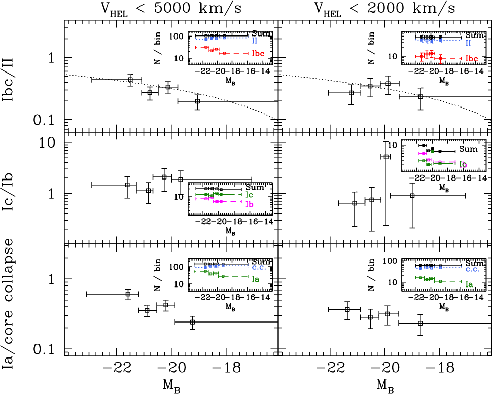 - Since the N(Ibc)/N(II) ratio depends on metallicity (PB03) and since cosmic metallicity decreases, on average, with redshift, that ratio is expected to decline with redshift, albeit very slowly.
