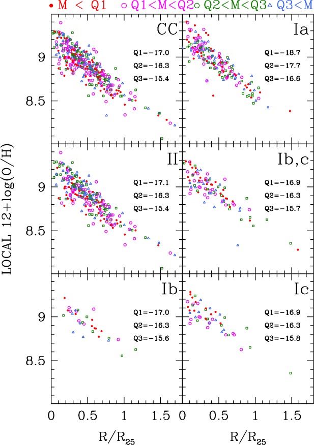 In an early attempt to determine empirically the role of metallicity in shaping the various CCSN types, Prantzos & Boissier (2003, PB03 in the following) studied the relationship between the number ratio of SNIbc to SNII N(Ibc)/N(II) versus the typical metallicity of the host galaxy. In the absence of relevant metallicity measurements, they used the galaxian luminosity as a proxy for metallicity, taking advantage of the well-known metallicity-luminosity relation.