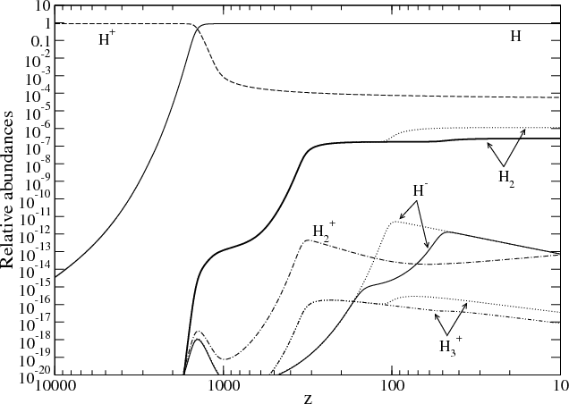 After hydrogen recombination, the decrease of the electron density leads to the inefficiency of thermal coupling between matter and radiation. The chemical processes occuring during this post-recombination period are essentially collisional (ionizations, radiative recombinations, attachments, etc.) and radiative, due to the active presence of the CMB photons. The chemical network leads gradually to the formation of the first molecules in the Universe (Glover & Savin 2009; Lepp & Shull 1984; Signore & Puy 1999; Stancil et al. 1998b; Lepp et al. 2002; Galli & Palla 1998; Puy et al. 1993; Puy & Signore 2007; Glover & Abel 2008; Pfenniger & Puy 2003).