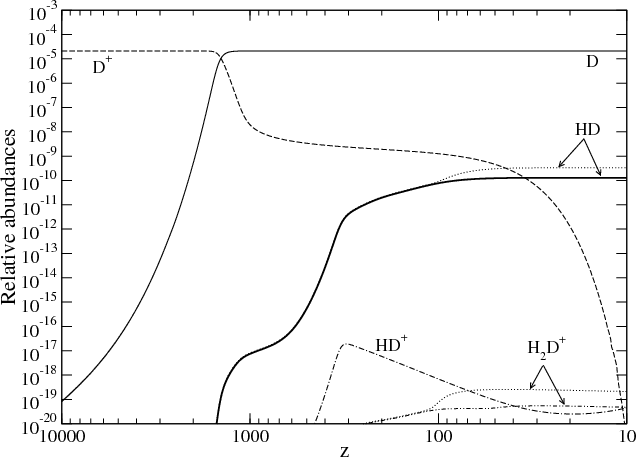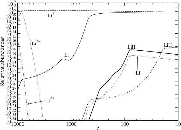 Primordial chemistry begins with the appearance of the first neutral species. Once a neutral species is formed, charge transfers with ions become efficient and lead to the formation of other neutral species and then molecular ions. Figure 1 shows the evolution of the chemical abundances during the successive periods of recombination for the light elements H, D, He and Li in the standard model. Helium nuclei are the first to recombine because of their high electronic binding energy. The recombination and photoionization rates for H and D are taken from Abel et al. (1997). We use the rates of Galli & Palla (1998) for He and for the reactions Li+ + e-