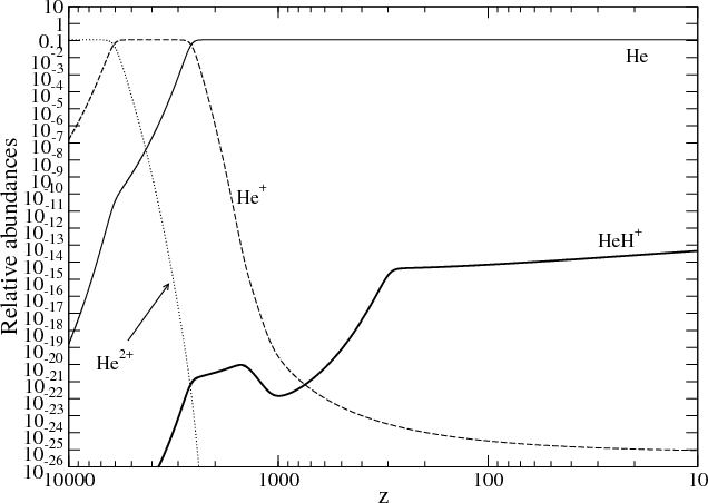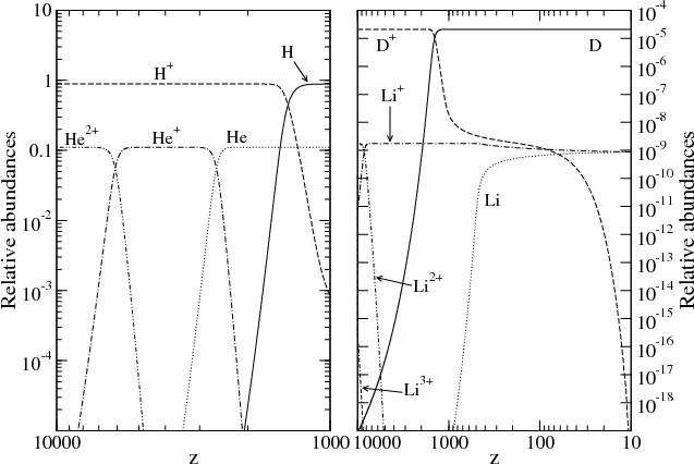 Figure 1: Successive cosmological recombination for hydrogen, deuterium, helium and lithium in the standard model of primordial chemistry. |