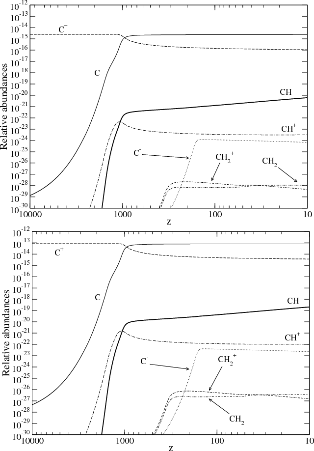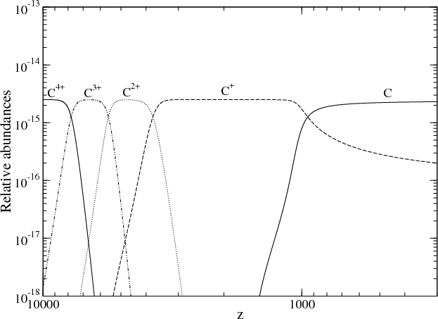 eV), C+ recombination occurs later than H+ recombination. Figure 2 shows that carbon is singly ionized at the beginning of the primordial chemistry. We conclude that it is not necessary to compute all the successive recombinations when calculating the evolution of the carbon species. Thus, we will consider that all the carbon ions are present as C+ at